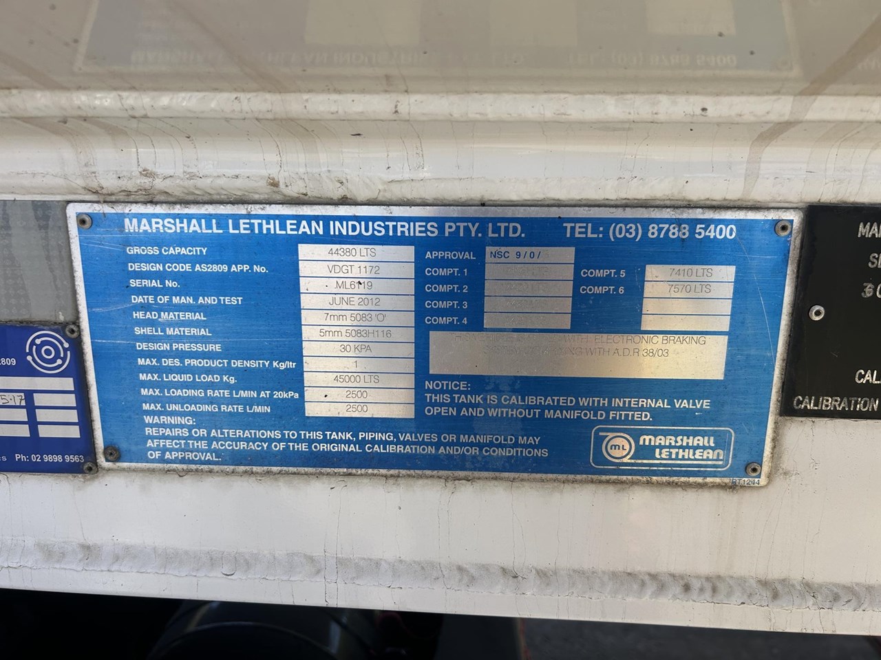 Title 2012 MARSHALL LETHLEAN TRIAXLE ALUMINIUM FUEL TANKER